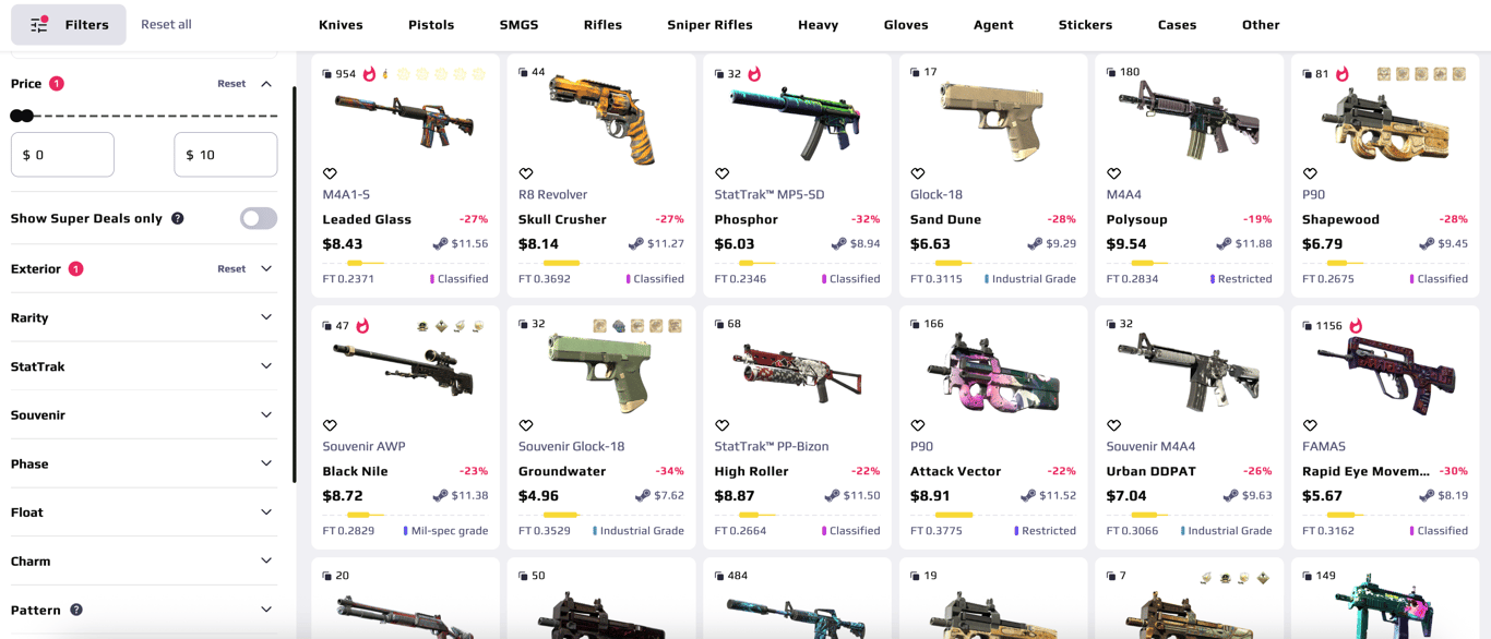 Below are 15 solid picks under $10 on white.market. Clean looks, good in-game presence, and stable availability. Click any listing on to see exact floats, cases, and buy options.