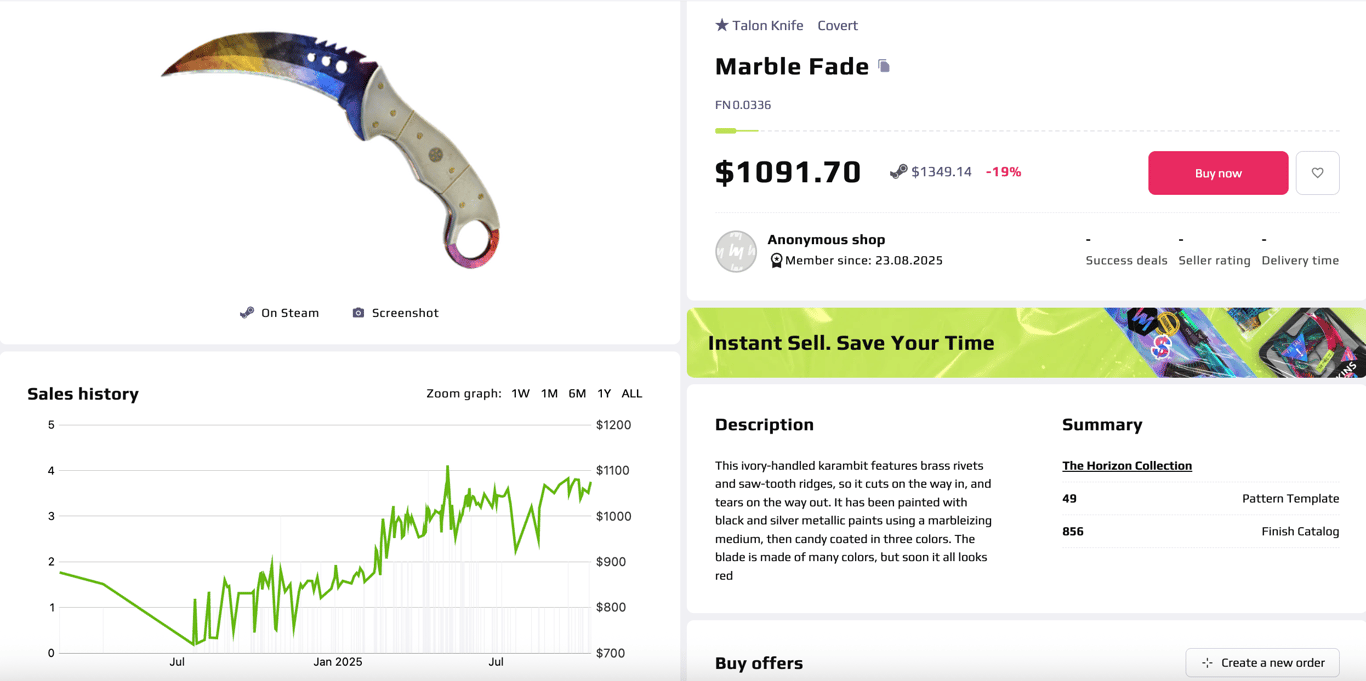P2P flow and no buyer fee. Your skin stays in the seller’s Steam inventory until the trade completes. Buyers pay 0% fee – that keeps costs down.