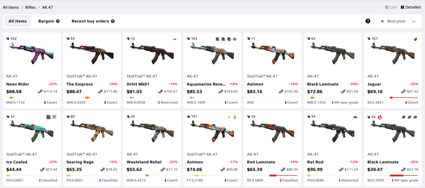 If you want actual market prices, don’t guess – check white.market. It shows live listings from real users. Prices update constantly. You can filter by float, wear, rarity and price. That makes it easy to see what a skin really sells for right now.