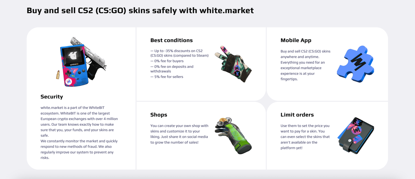 The white.market CS2 fees model is simple: 0% for buyers, 0% on deposits and withdrawals via WhiteBIT Codes, and 5% for sellers on completed trades, with payouts available in fiat and crypto, so you avoid both the 15% cut and the wallet lock that you get on the Community Market.