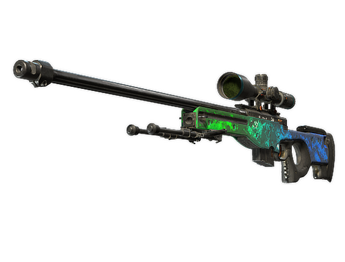 Mit hohem Risiko und hohem Gewinn ist die AWP wegen des unverkennbaren Schussgeräusches und ihrer tödlichen Einzeltreffer berüchtigt. Die Waffe wurde mit einer Sonderlackierung in einem leuchtend grünen und blauen Farbverlauf versehen.