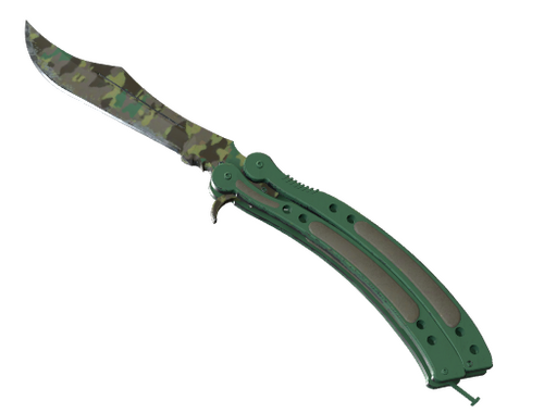 Dies ist ein speziell angefertigtes Balisong, allgemein als Butterflymesser bekannt. Das definierende Merkmal dieser Waffe ist das fächerartige Aufklappen einer frei rotierenden Klinge, welches ein schnelles Hervorholen sowie Verstecken ermöglicht. Aufgrund dessen sind Butterflymesser in vielen Ländern gesetzlich verboten. Die Waffe wurde durch Wassertransferdruck mit einem Waldtarnmuster versehen.