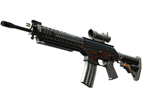 Die den Terroristen vorbehaltene SG 553 ist eine hochklassige und mit einem Zielfernrohr ausgestattete Alternative zur AK-47, wenn es um effektiven Kampf auf lange Distanz geht. Die schwarze Grundierung der Waffe wurde mit orangefarbenen und gelben Akzenten versehen. Auf der Rückseite des Kolbens sind drei Sterne aufgemalt.