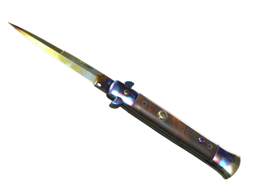 Historisch gesehen ein Brennpunkt der Auseinandersetzung und sogar der Regulierung. Dieses Stilett-Springmesser im italienischen Stil hat eine gefederte Klinge, die durch Druck einer Ausklinknase augenblicklich ausklappt. Die Waffe wurde durch Anwendung von Holzkohle unter hohen Temperaturen buntgehärtet.