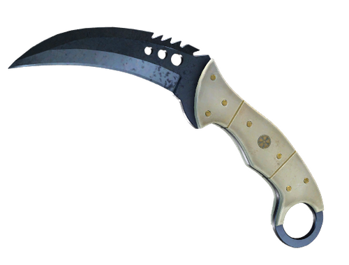 Dieses Karambit mit Elfenbeingriff hat Messingnieten und einen Säbelzahnrücken, sodass es beim Eindringen schneidet und beim Herausziehen reißt. Die Waffe wurde kalt gebläut.