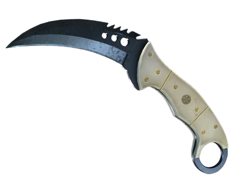 Dieses Karambit mit Elfenbeingriff hat Messingnieten und einen Säbelzahnrücken, sodass es beim Eindringen schneidet und beim Herausziehen reißt. Die Waffe wurde kalt gebläut.