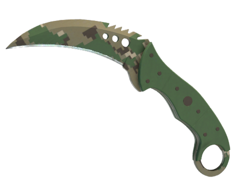 Dieses Karambit mit Elfenbeingriff hat Messingnieten und einen Säbelzahnrücken, sodass es beim Eindringen schneidet und beim Herausziehen reißt. Die Waffe wurde durch Wassertransferdruck mit einem Digital Disruptive Pattern (DDPAT) versehen.