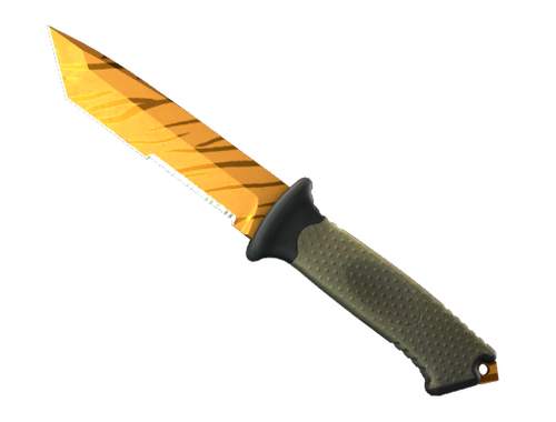 Dieses Überlebensmesser im Tantō-Stil hat eine facettierte und fein geschliffene Klinge sowie einen Schlagknauf. Kein Hokuspokus und keine beweglichen Teile – nur eine zuverlässige Klinge. Die Waffe wurde orange eloxiert und durch Handgravur mit einen Tigerstreifenmuster versehen.