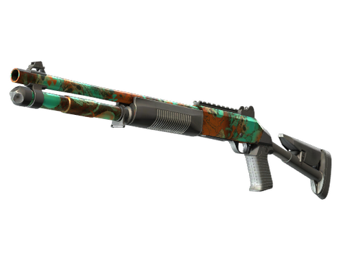 Die XM1014 ist eine schlagkräftige, vollautomatische Schrotflinte, die ihren höheren Preis mit der Fähigkeit rechtfertigt, einen Raum schnell mit Blei zu füllen. Die Waffe wurde verchromt und anschließend durch Wassertransferdruck mit einem halbdurchsichtigen Muster aus nuklearen Totenköpfen und Knochen überlagert. Kollektion „Cache“
