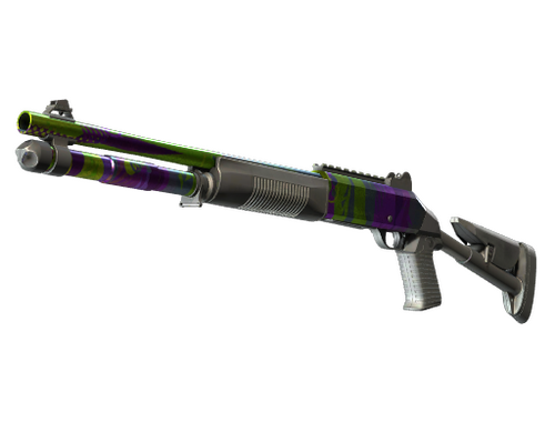 Die XM1014 ist eine schlagkräftige, vollautomatische Schrotflinte, die ihren höheren Preis mit der Fähigkeit rechtfertigt, einen Raum schnell mit Blei zu füllen. Die Waffe wurde mit einem zufälligen Muster aus Chartreuse, Violett und Silber versehen.