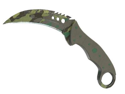 Dieses Karambit mit Elfenbeingriff hat Messingnieten und einen Säbelzahnrücken, sodass es beim Eindringen schneidet und beim Herausziehen reißt. Die Waffe wurde durch Wassertransferdruck mit einem Waldtarnmuster versehen.