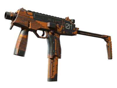Die in der Schweiz hergestellte, innovative Maschinenpistole MP9 ist eine ergonomische Polymer-Waffe, die von privaten Sicherheitsfirmen bevorzugt wird. Die Waffe wurde von Hand mit einem orangen und schwarzen Design bemalt.