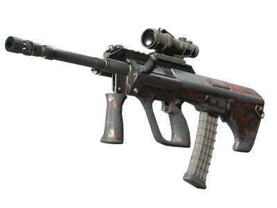 Poderoso y preciso, el rifle de asalto con mira telescópica AUG compensa sus largos tiempos de recarga con su baja dispersión y una alta cadencia de fuego. Se ha aplicado un patrón de placa de circuito roja sobre una base negra.