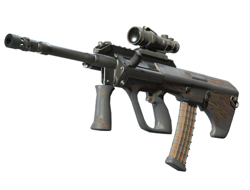 Poderoso y preciso, el rifle de asalto con mira telescópica AUG compensa sus largos tiempos de recarga con su baja dispersión y una alta cadencia de fuego. Se ha aplicado un patrón hidrográfico que imita la apariencia de madera seca.
