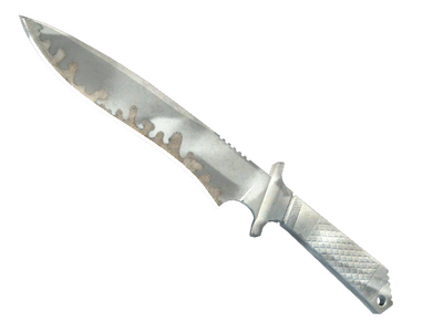 Un clásico de la serie de Counter‑Strike, el filo de este cuchillo es de estelite y está encajado a presión firmemente en su sitio gracias a su ajuste preciso con el titanio del filo y del lomo de la hoja. El mango es de marfil de mastodonte fosilizado, envuelto en un revestimiento de fibra de carbono. Se ha pintado con espray usando una cinta de pintor enredada como plantilla.