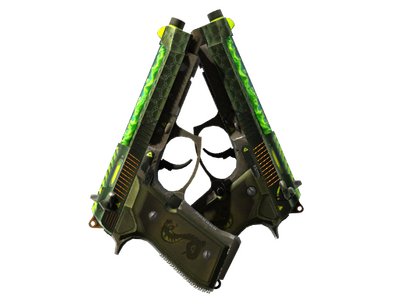 Disparar dos Berettas a la vez disminuirá la precisión y aumentará los tiempos de recarga. El lado positivo es que podrás disparar dos Berettas a la vez. Se ha pintado a mano una cobra en cada una de sus empuñaduras. En la corredera lleva un neón que simula el veneno.