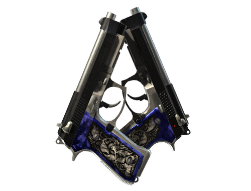 Disparar dos Berettas a la vez disminuirá la precisión y aumentará los tiempos de recarga. El lado positivo es que podrás disparar dos Berettas a la vez. Se le ha aplicado una empuñadura de nácar pintada y una pátina oscura a propósito.