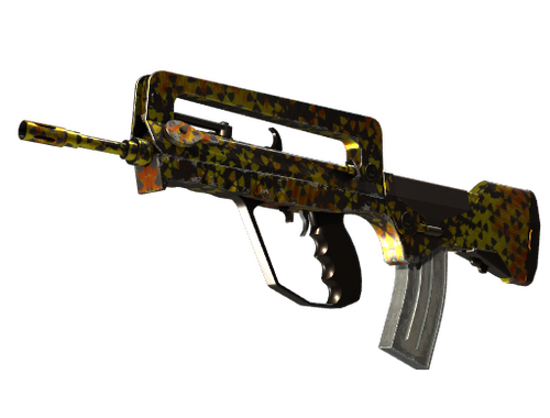 Una opción económica para los jugadores con poco dinero, el FAMAS cubre con efectividad el vacío que hay entre el más caro de los rifles y el subfusil menos efectivo. Se ha pintado con un patrón de símbolos de peligro nuclear usando tonos metalizados.