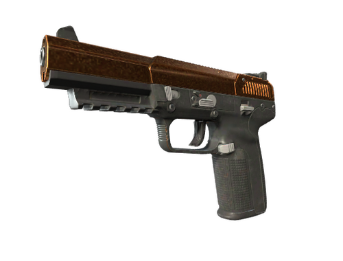 Muy precisa y perforante, la cara Five-seveN es lenta de recargar, pero lo compensa con un generoso cargador de 20 balas y un bajo retroceso. Se le ha aplicado una pintura con escamas metálicas.