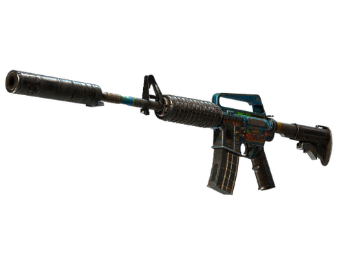 El M4A1 con silenciador tiene un cargador más pequeño que su homólogo no silenciado, pero proporciona disparos menos audibles con menor retroceso y mayor precisión. Se ha pintado a mano con coloridos paneles e interruptores sobre una base azul.