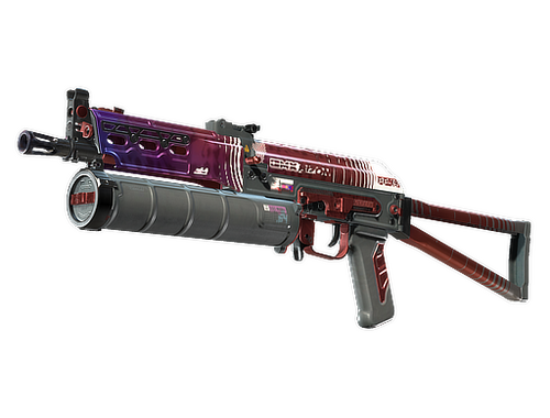 El subfusil PP-Bizon no causa mucho daño, pero ofrece un cargador cilíndrico de alta capacidad y diseño único que se recarga rápidamente. It has been custom painted with a purple gradient and a red and white design.