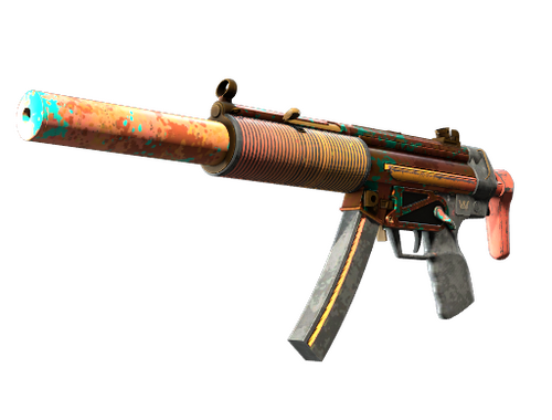A menudo imitado pero nunca igualado, el emblemático MP5 es quizá el subfusil más versátil y popular del mundo. Esta variante SD viene equipada con un silenciador integrado, lo que convierte a un arma ya de por sí formidable en silenciosa. Se ha aplicado un patrón de camuflaje en tonos naranja y azul verdoso brillantes. El arma se ha decorado con detalles dorados.