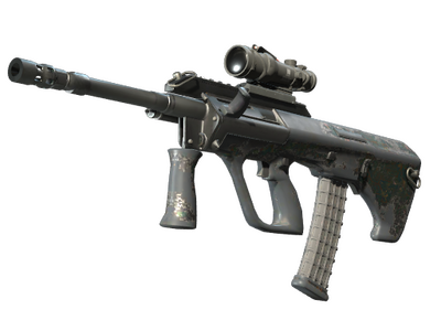 Poderoso y preciso, el rifle de asalto con mira telescópica AUG compensa sus largos tiempos de recarga con su baja dispersión y una alta cadencia de fuego. Se le ha aplicado una pintura personalizada con un HUD a vista de pájaro superpuesto a un patrón de mapa.