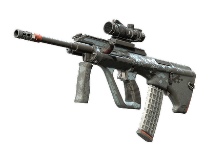 Poderoso y preciso, el rifle de asalto con mira telescópica AUG compensa sus largos tiempos de recarga con su baja dispersión y una alta cadencia de fuego. Se ha aplicado un patrón isométrico azul y un acabado con detalles naranjas.