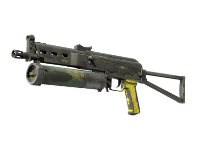 El subfusil PP-Bizon no causa mucho daño, pero ofrece un cargador cilíndrico de alta capacidad y diseño único que se recarga rápidamente. Se ha personalizado con un adhesivo hidrográfico de tonos verdes y amarillos.