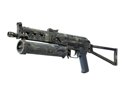 El subfusil PP-Bizon no causa mucho daño, pero ofrece un cargador cilíndrico de alta capacidad y diseño único que se recarga rápidamente. Se le ha aplicado un adhesivo hidrográfico de camuflaje variado.