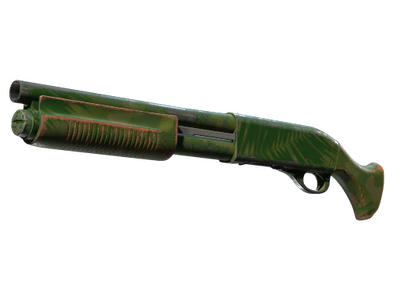 La clásica recortada hace mucho daño a corta distancia, pero dada su poca precisión, alta dispersión de las balas y baja cadencia de disparo, será mejor que si disparas a alguien no lo dejes con vida. Se ha pintado con espray con hojas de palma verde oscuro sobre un camuflaje de color jungla.