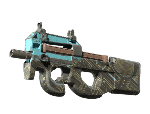 Facilement reconnaissable par son architecture « bullpup », le P90 est une excellente arme pour tirer tout en se déplaçant grâce à son chargeur grande capacité et son faible recul. Cette arme a été personnalisée en appliquant un film hydrographique bleu et jaune qui ressemble à une centrale nucléaire.