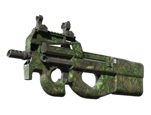 Facilement reconnaissable par son architecture « bullpup », le P90 est une excellente arme pour tirer tout en se déplaçant grâce à son chargeur grande capacité et son faible recul. Un motif floral a été peint à la bombe dans différentes nuances de vert.