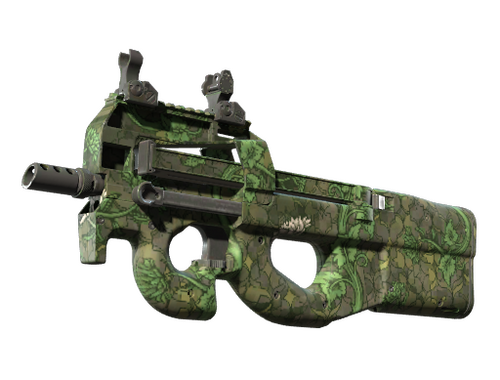 Facilement reconnaissable par son architecture « bullpup », le P90 est une excellente arme pour tirer tout en se déplaçant grâce à son chargeur grande capacité et son faible recul. Un motif floral a été peint à la bombe dans différentes nuances de vert.