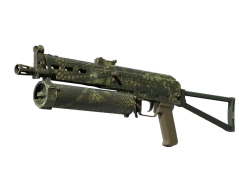 Le pistolet mitrailleur Bizon inflige de faible dégâts, mais offre un chargeur hélicoïdal haute capacité de conception unique qui permet de recharger rapidement. Un motif d'écailles de lézard vert et noir a été peint sur cette arme par hydrographie.