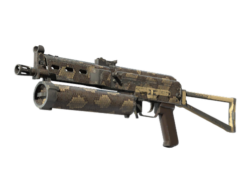 Le pistolet mitrailleur Bizon inflige de faible dégâts, mais offre un chargeur hélicoïdal haute capacité de conception unique qui permet de recharger rapidement. Cette arme a été personnalisée en utilisant un film hydrographique peau de serpent.