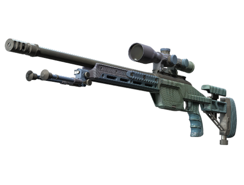 Le SSG08 à verrou inflige de faibles dégâts, mais est un excellent fusil de précision en matière de cout-efficacité, ce qui en fait un choix judicieux en début de partie pour les spécialistes du tir embusqué. Cette arme a été personnalisée avec des spirales en demi-teinte vert et bleu.