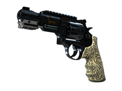 Le révolver R8 offre une précision et une puissance de tir considérables, aux dépens d'une gâchette très résistante. À bout portant, préférez marteler le chien pour bénéficier d'une vitesse de tir élevée au détriment de la précision. Des ornements gravés sur un métal bleu décorent la crosse ivoire de l'arme.