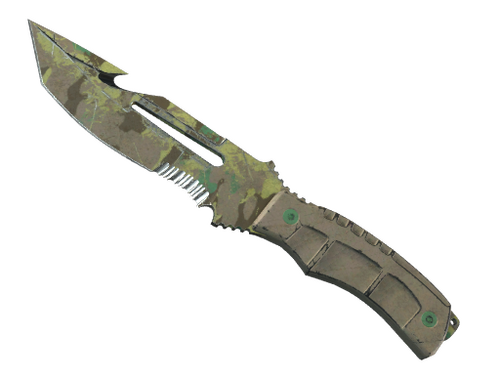 Ce couteau de survie multi-usage est composé d'un crochet tranchant pour le dépeçage et d'une lame crantée pour découper des matériaux denses, comme les os ou la fibre synthétique. Des vis hexagonales maintiennent la lame au manche en composite. Cette arme a été personnalisée en utilisant un film hydrographique d'un camouflage tempéré.
