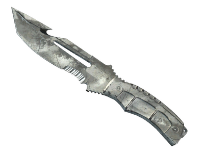 Ce couteau de survie multi-usage est composé d'un crochet tranchant pour le dépeçage et d'une lame crantée pour découper des matériaux denses, comme les os ou la fibre synthétique. Des vis hexagonales maintiennent la lame au manche en composite. Cette arme a été peinte à la bombe à l'aide d'un enchevêtrement de ruban adhésif utilisé comme un pochoir.