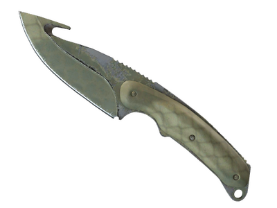 La principale caractéristique d'un couteau à éviscérer est le crochet placé sur le dos de la lame. Popularisé à l'origine comme une aide pour dépecer le gibier, le crochet est aussi efficace pour découper avec facilité les matériaux fibreux comme des cordes, sangles ou ceintures de sécurité. Cette arme a été peinte à la bombe avec des pochoirs tel que du grillage à maille serrée et du carton découpé.