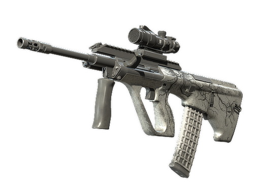 Powerful and accurate, the AUG scoped assault rifle compensates for its long reload times with low spread and a high rate of fire. It has been painted with gnarled branches and birds over a silver base.