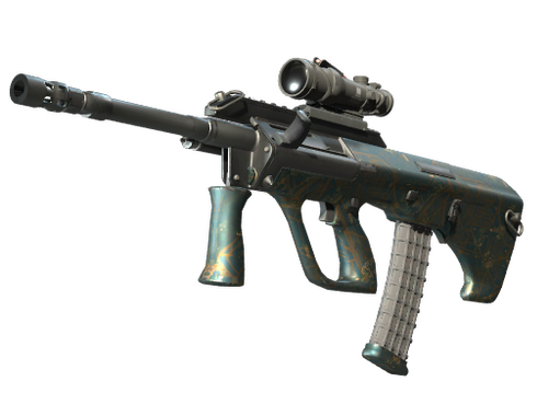 Powerful and accurate, the AUG scoped assault rifle compensates for its long reload times with low spread and a high rate of fire. A custom paint job of a map pattern overlayed with a bird's eye HUD has been applied.