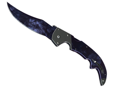 A modern homage to a falchion sword, this clip point blade has a curved edge. It has been painted with black and silver metallic paints using a marbleizing medium, then candy coated.