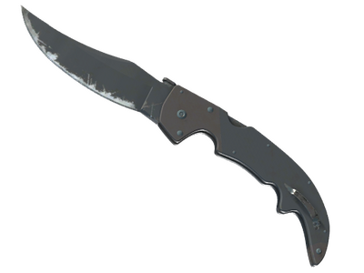 A modern homage to a falchion sword, this clip point blade has a curved edge. It has individual parts spray-painted solid colors in a night ops color scheme.