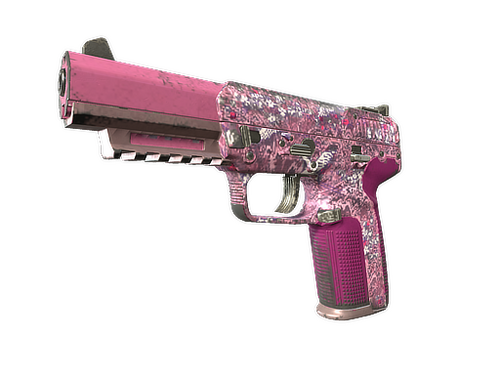 Highly accurate and armor-piercing, the pricy Five-Seven is a slow-loader that compensates with a generous 20-round magazine and forgiving recoil. A pink and white pattern of cranes and flowers has been applied.