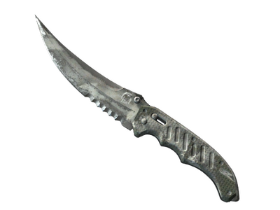 Flip knives sport a Persian-style back-swept blade with an acute point. While the point itself may be fragile, the overall design of the flip knife's design is surprisingly durable. It has been spray-painted using a tangle of masking tape as a stencil.