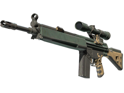 The pricy G3SG1 lowers movement speed considerably but compensates with a higher rate of fire than other sniper rifles. It has individual parts spray-painted tan, navy and dark green.