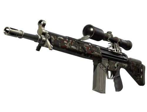 The pricy G3SG1 lowers movement speed considerably but compensates with a higher rate of fire than other sniper rifles. It has been painted with a custom red, white, and charcoal-colored DDPAT pattern.