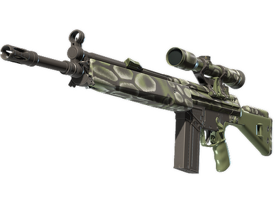 The pricy G3SG1 lowers movement speed considerably but compensates with a higher rate of fire than other sniper rifles. It has been spray-painted with a green and black hex pattern.
